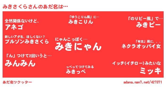 | 意味不明あだ名 | 『自称みきさくら』『ペロリンみきさくら』『なめこ科みきさくら属』 |