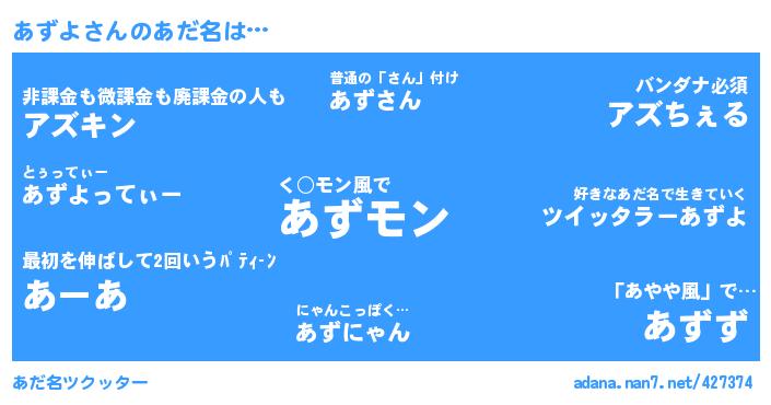 | ヒーロー風カッコイイあだ名 | 『ウルトラあずよマン』『仮面アズダー』『ネオアズヨ』 |