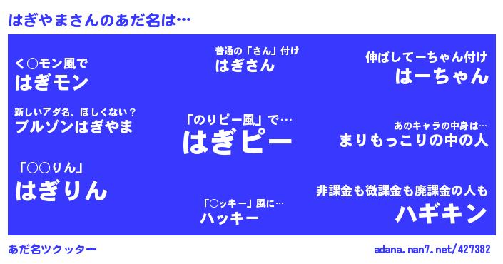 | ポケモン風あだ名 | 『ヒハギヤマ』『ハギヤダネ』『ハックウザ』『メロハッギ』 |