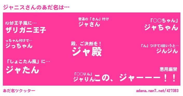 | 男性向けラノベタイトル風あだ名 | 『この素晴らしい世界にジャニスを!』『魔法科高校のジャニス』 |