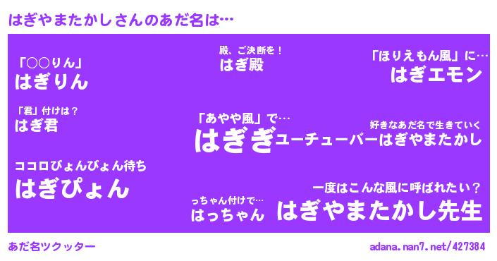 | 女子向けラノベタイトル風あだ名 | 『はぎやまたかし様がみてる』『はぎやまたかしの契約王妃』 |