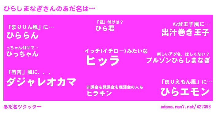 | ヒーロー風カッコイイあだ名 | 『ネオヒラシマナギ』『仮面ヒラダー』『愛の使者ひらしまなぎ』 |