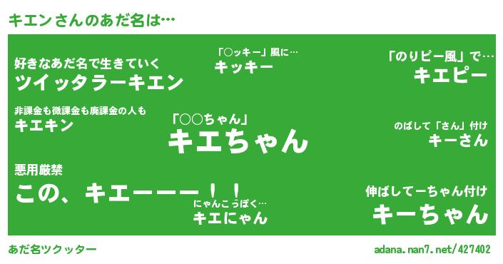 | ポケモン風あだ名 | 『キーエイ』『ヒキエン』『キエンダネ』『キエゴンZ』 |