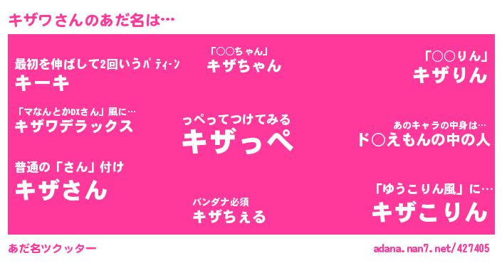 | ヘコむあだ名 | 『キザふぇ~』『豆乳』『キザぷりん』『キザワ(小並感)』 |