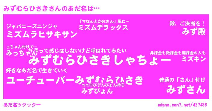 | 男性向けラノベタイトル風あだ名 | 『みずむらひさき~年齢イコール彼女いない歴の魔法使い~』 |