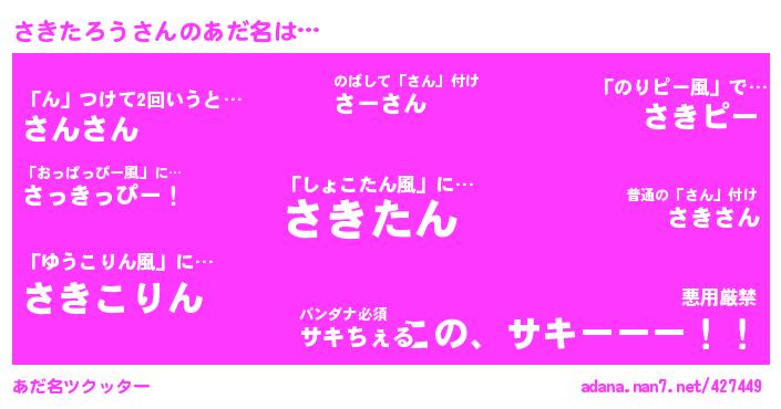 | 男性向けラノベタイトル風あだ名 | 『うちのさきたろうが世界を掌握している!』『魔法科高校のさきたろう』 |