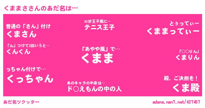 | ポケモン風あだ名 | 『クマゴンZ』『クックウザ』『クーマイ』『クマセウス』 |