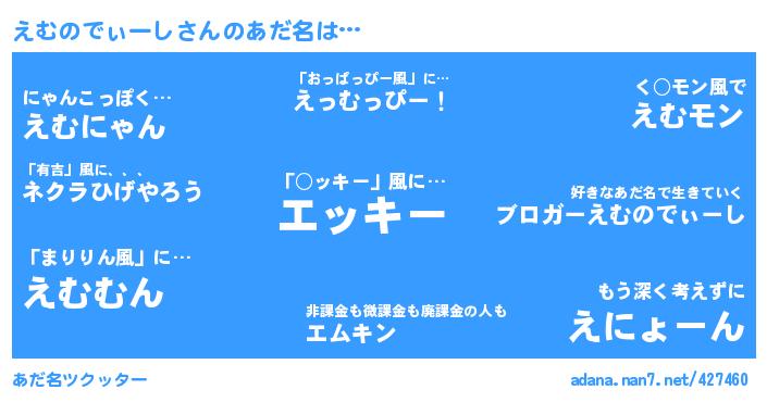 | 女子向けラノベタイトル風あだ名 | 『えむのでぃーしの玉の輿計画!』『えむのでぃーし恋絵巻』 |