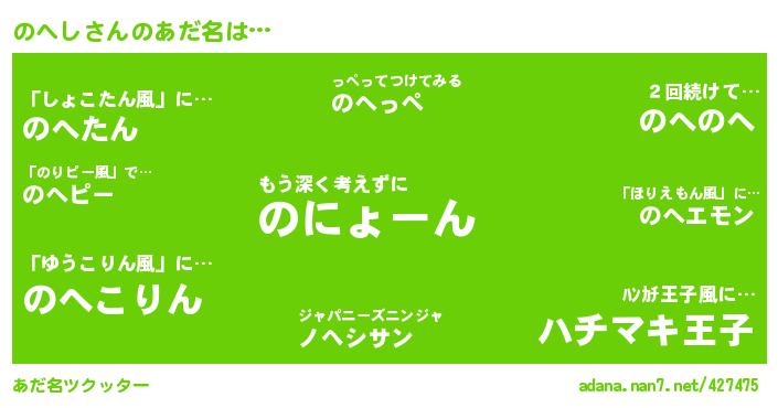 | 男性向けラノベタイトル風あだ名 | 『この素晴らしい世界にのへしを!』『のへしの憂鬱』『ノヘシスレイヤー』 |