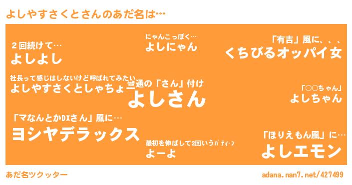 | ヘコむあだ名 | 『よしふぇ~』『豆乳』『よしぷりん』『よしやすさくと(小並感)』 |