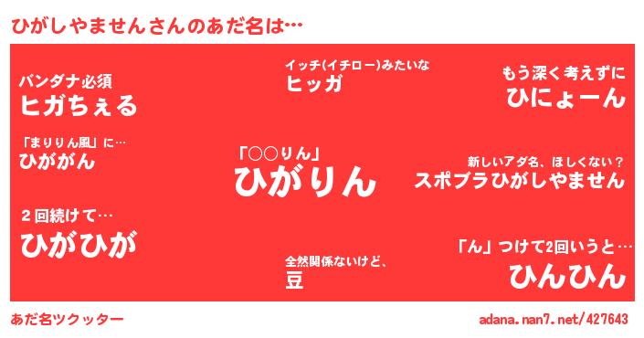 | ヘコむあだ名 | 『ひがふぇ~』『豆乳』『ひがぷりん』『ひがしやません(小並感)』 |