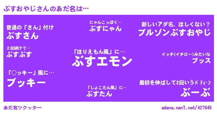 | 欧米人風あだ名 | 『ダニエルぶすおやじ』『アンジェラ・ぶすおやじ』『ウサインぶすおやじ』 |