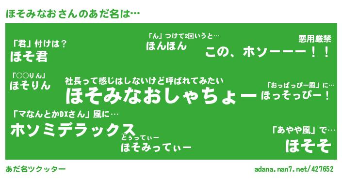 | 男性向けラノベタイトル風あだ名 | 『うちのほそみなおが世界を掌握している!』『転生したらほそみなおだった件』 |