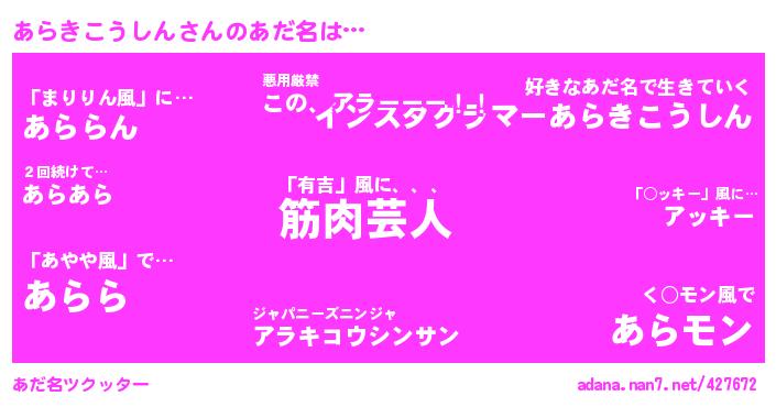 | 意味不明あだ名 | 『永久保存あらきこうしん』『眠気覚ましガムあらきこうしん味』 |