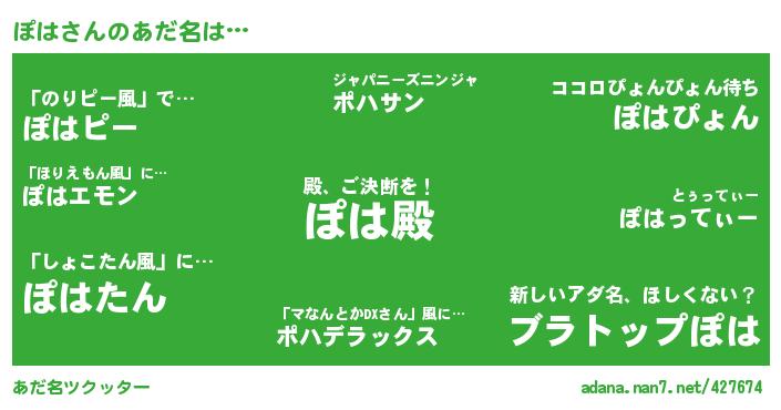 | 男性向けラノベタイトル風あだ名 | 『Re:ぽはから始める異世界生活』『冴えないぽはの育てかた』 |