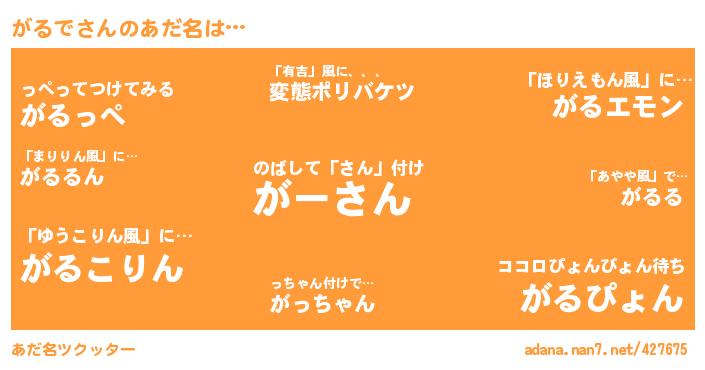 | ヘコむあだ名 | 『がるふぇ~』『豆乳』『がるぷりん』『がるで(小並感)』 |