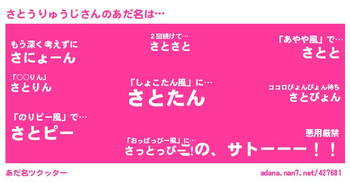| 男性向けラノベタイトル風あだ名 | 『ノーゲーム・ノーサトウリュウジ』『転生したらさとうりゅうじだった件』 |