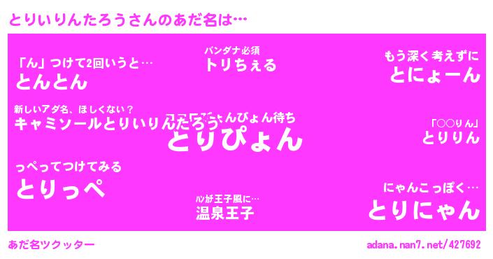 | 意味不明あだ名 | 『住所不定無職とりいりんたろう(40歳)』『永久保存とりいりんたろう』 |