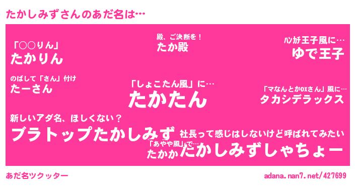 | ヘコむあだ名 | 『たかふぇ~』『豆乳』『たかぷりん』『たかしみず(小並感)』 |