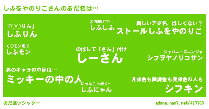 | 男性向けラノベタイトル風あだ名 | 『シフヲヤノリコアートオンライン』『魔法科高校のしふをやのりこ』 |