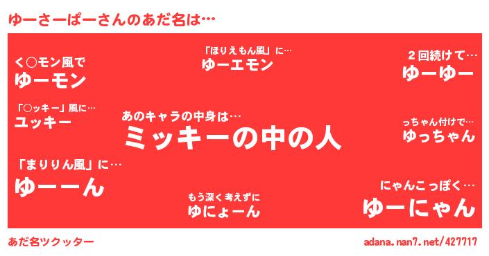 | ヒーロー風カッコイイあだ名 | 『仮面ユーダー』『ウルトラゆーさーぱーマン』『愛の使者ゆーさーぱー』 |