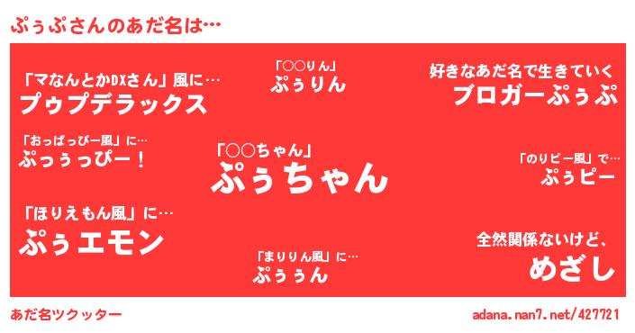 | ヒーロー風カッコイイあだ名 | 『ウルトラぷぅぷマン』『仮面プゥダー』『愛の使者ぷぅぷ』 |