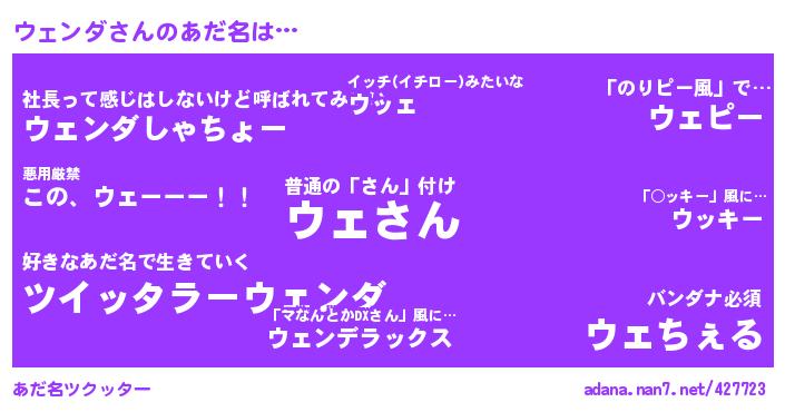 | 男性向けラノベタイトル風あだ名 | 『ノーゲーム・ノーウェンダ』『魔法科高校のウェンダ』 |