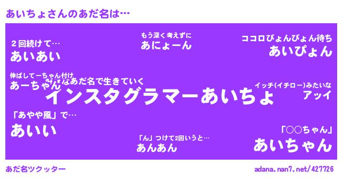 | 男性向けラノベタイトル風あだ名 | 『あいちょの嫁は女の子じゃないと思った?』『冴えないあいちょの育てかた』 |