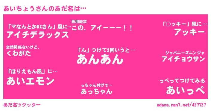 | 女子向けラノベタイトル風あだ名 | 『異世界でカフェあいちょうを開店しました。』『あいちょうアンティーク』 |