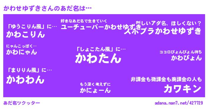 | ヘコむあだ名 | 『かわふぇ~』『豆乳』『かわぷりん』『かわせゆずき(小並感)』 |