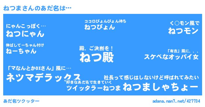 | 男性向けラノベタイトル風あだ名 | 『ねつまの嫁は女の子じゃないと思った?』『はたらくねつまさま!』 |