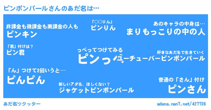| ポケモン風あだ名 | 『ピックウザ』『ピーンイ』『ピンキング』『ヒピンポンパール』 |