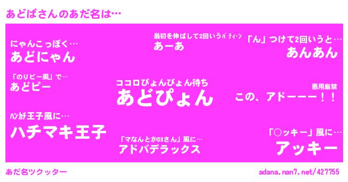 | ヘコむあだ名 | 『あどふぇ~』『豆乳』『あどぷりん』『あどば(小並感)』 |