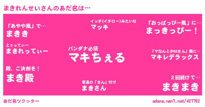 | ヘコむあだ名 | 『まきふぇ~』『豆乳』『まきぷりん』『まきれんせい(小並感)』 |
