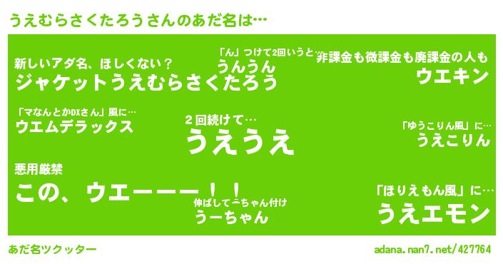 | ポケモン風あだ名 | 『メロウッエ』『ヒウエムラサクタロウ』『ゼニウエ』『ウエセウス』 |