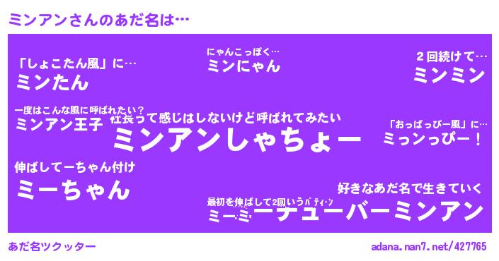 | 意味不明あだ名 | 『永久保存ミンアン』『ミンアンフォーエバー』『なめこ科ミンアン属』 |