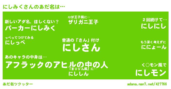 | ヘコむあだ名 | 『にしふぇ~』『豆乳』『にしぷりん』『にしみく(小並感)』 |