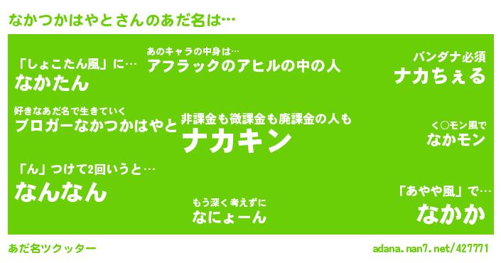 | 意味不明あだ名 | 『自称なかつかはやと』『住所不定無職なかつかはやと(79歳)』 |