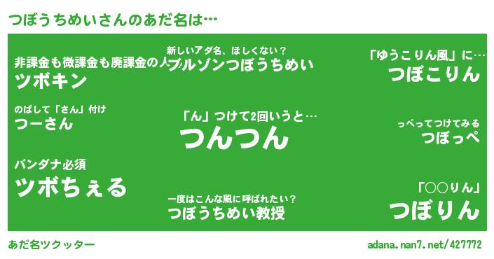 | ポケモン風あだ名 | 『ツックウザ』『ヒツボウチメイ』『ツボセウス』『ゼニツボ』 |