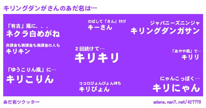 | 男性向けラノベタイトル風あだ名 | 『Re:キリングダンがから始める異世界生活』『魔弾の王とキリングダンが』 |