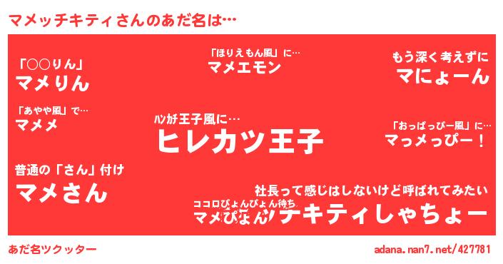 | 胡散臭い通販商品みたいなあだ名 | 『運命の人と巡り会える高級そうな壺…その名も「マメッチキティ」』 |