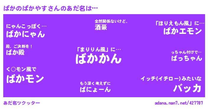 | 男性向けラノベタイトル風あだ名 | 『Re:ばかのばかやすから始める異世界生活』『バカノバカヤススレイヤー』 |