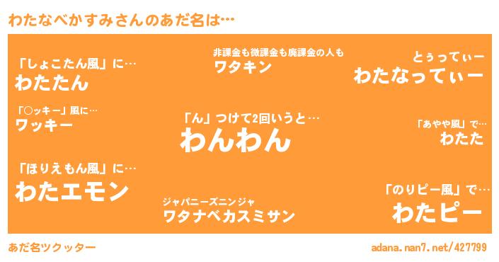 | ヘコむあだ名 | 『わたふぇ~』『豆乳』『わたぷりん』『わたなべかすみ(小並感)』 |