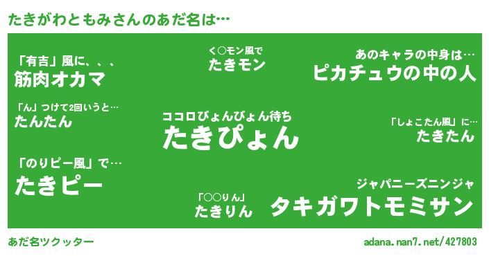 | ヘコむあだ名 | 『たきふぇ~』『豆乳』『たきぷりん』『たきがわともみ(小並感)』 |