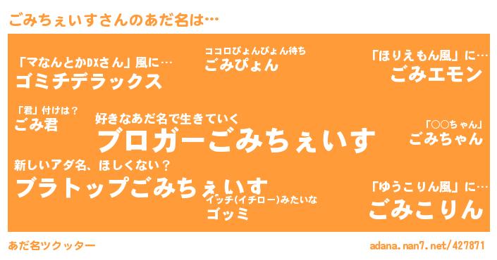 | 男性向けラノベタイトル風あだ名 | 『ごみちぇいすの嫁は女の子じゃないと思った?』 |