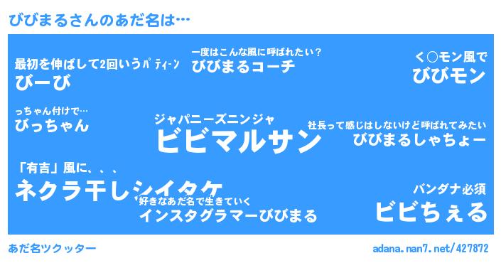 | 意味不明あだ名 | 『びびまるフォーエバー』『自称びびまる』『ペロリンびびまる』 |
