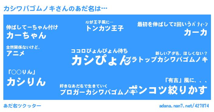 | 男性向けラノベタイトル風あだ名 | 『カシワバゴムノキアートオンライン』『ノーゲーム・ノーカシワバゴムノキ』 |