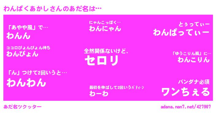 | ヘコむあだ名 | 『わんふぇ~』『豆乳』『わんぷりん』『わんぱくあかし(小並感)』 |