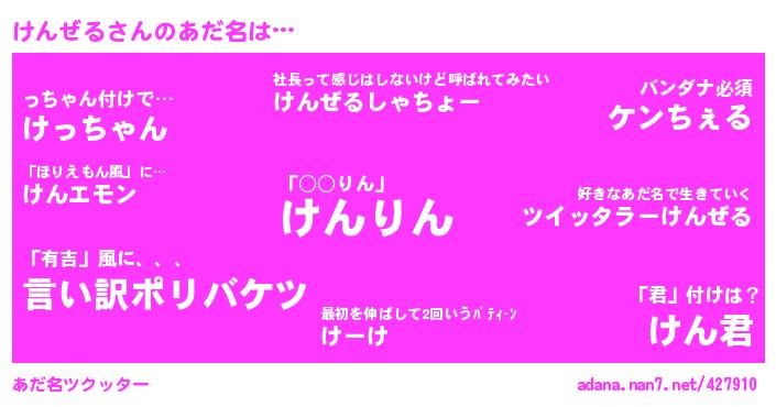 | ヘコむあだ名 | 『けんふぇ~』『豆乳』『けんぷりん』『けんぜる(小並感)』 |