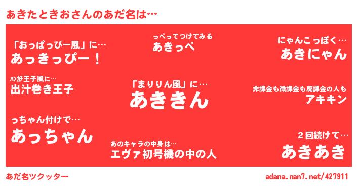 | 男性向けラノベタイトル風あだ名 | 『この素晴らしい世界にあきたときおを!』『アキタトキオアートオンライン』 |